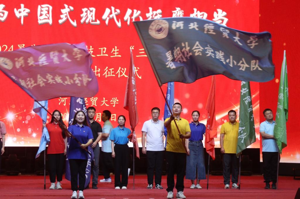 7月7日下午,公司实践小分队在校礼堂参加出征仪式,院团委书记梁旭辉代表实践团队接受出征旗帜。