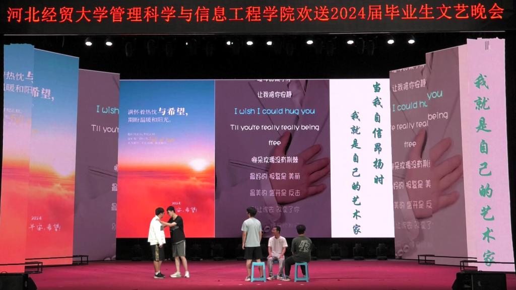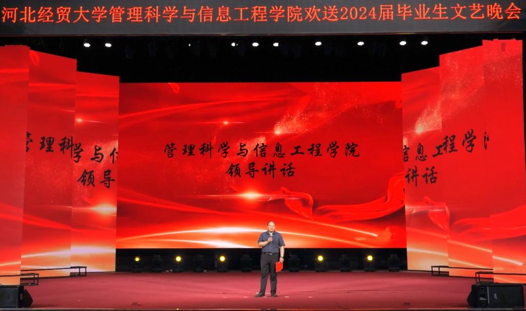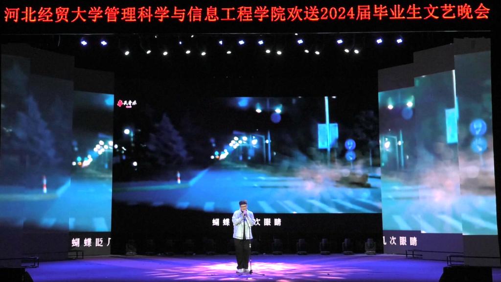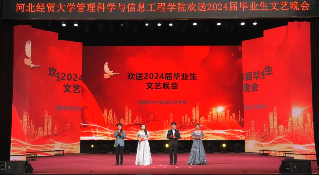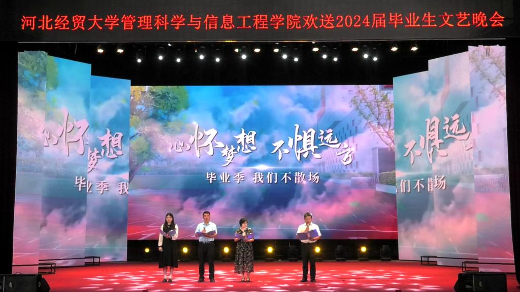 晚会在动感十足的爵士舞《Magnetic》中拉开序幕。公司党委书记王剑彪向毕业生表达了诚挚的祝愿,叮嘱同学们要学会自我欣赏、学会独立坚强;希望同学们努力拼搏,不负韶华,不负时代,欢迎同学们常回家看看。毕业班辅导员带来的诗歌朗诵真挚而热烈,饱含深情,让人动容。武术与琵琶碰撞出了不一样的火花,给同学们带来了震撼的体验;小品《扇子的意义》带给师生欢声笑语的同时又不失温情,引起了同学们强烈的共鸣;相声《翻译情书》贴近生活,引得台下欢声一片;心理剧《黑与白》在欢笑中更发人深省;民族舞蹈《西楼别序》尽显经贸学子的优雅与端庄;串烧舞蹈、歌曲《玫瑰少年》、《你不知道的事》《想把你留在这里》等精彩纷呈,给同学们带来了不一样的视听盛宴,一首《启程》承载着老师对同学们的祝愿与期望,将现场氛围推向了高潮。