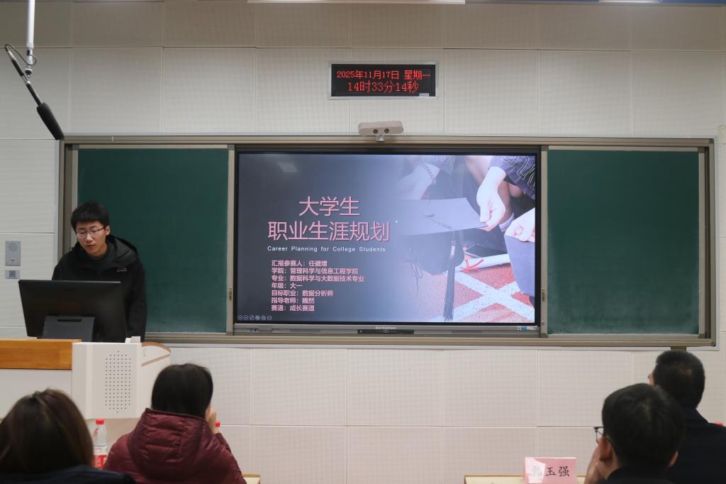 首先,由成长赛道和就业赛道的获奖同学展示他们的作品。他们的作品内容丰富多样,制定了清晰明确的职业目标与发展路径,提出了新颖的职业规划方案,充分展现了当代老员工对未来职业的深入思考和积极探索精神。在展示过程中,同学们自信从容,表达流畅,赢得了评委和观众的阵阵掌声。