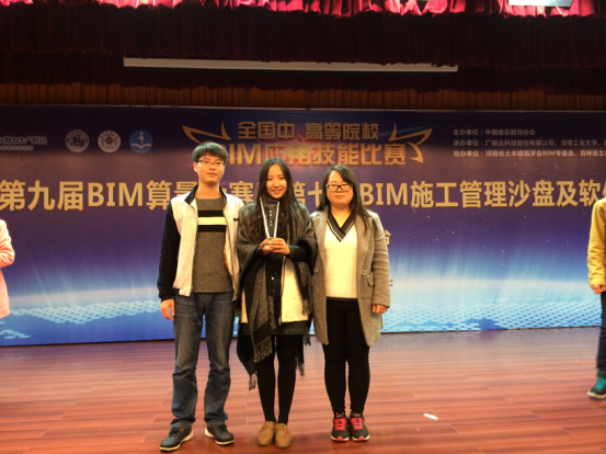 代表队由曹聪慧、宋晓刚两位老师指导。工程管理教研室主任李伟红老师率2013级工程管理专业员工胡航辉、2014级工程管理专业员工徐小宇和麻皓予三位选手参赛。在紧张的角逐中,三名同学不畏强手,沉着应战,熟练操作,团结协作,展现出顽强的拼搏精神和扎实的基本功,最终荣获全能赛和BIM安装算量两个一等奖及常规赛、BIM招标项目管理两个二等奖的佳绩。