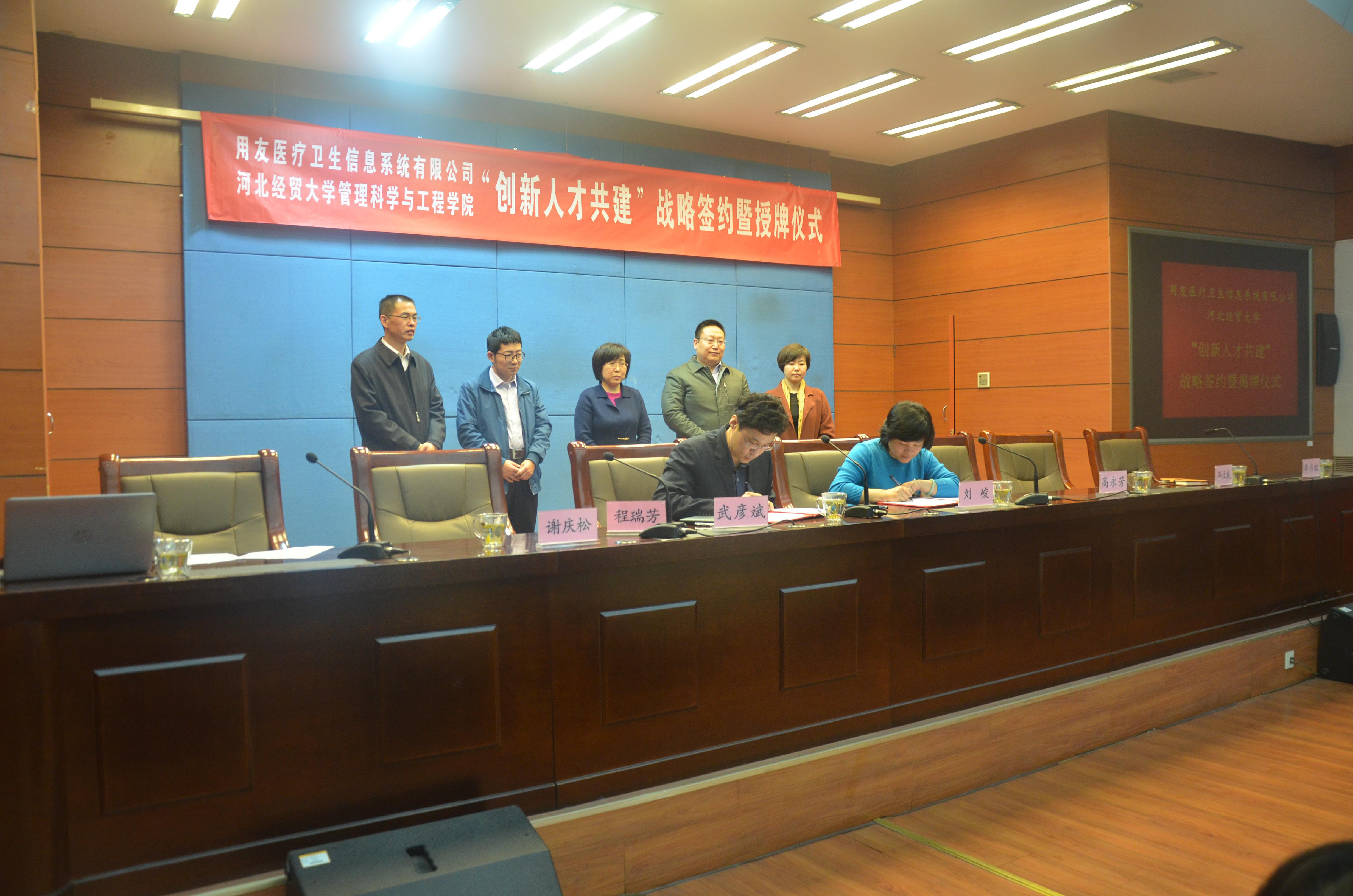 2018年3月12日下午,公司在视频会议室举行“创新人才共建”战略签约暨揭牌仪式。用友医疗卫生信息系统有限公司副总裁刘峻,用友集团人力资源部经理谢庆松,教务处处长程瑞芳教授、副处长孙立威、公司领导班子出席。仪式由公司经理武彦斌主持,公司全体教师及部分员工参加.