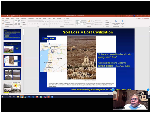 黄基华教授首先引入全球各地以及美国土壤侵蚀的实例,指出了土壤侵蚀的基本过程及危害,强调土壤流失等同于文明的丧失,介绍了土壤侵蚀和水土保持效果评估的研究进展,详细阐述了土壤侵蚀预测技术、侵蚀预测模型以及在做野外侵蚀评估中面临的挑战。