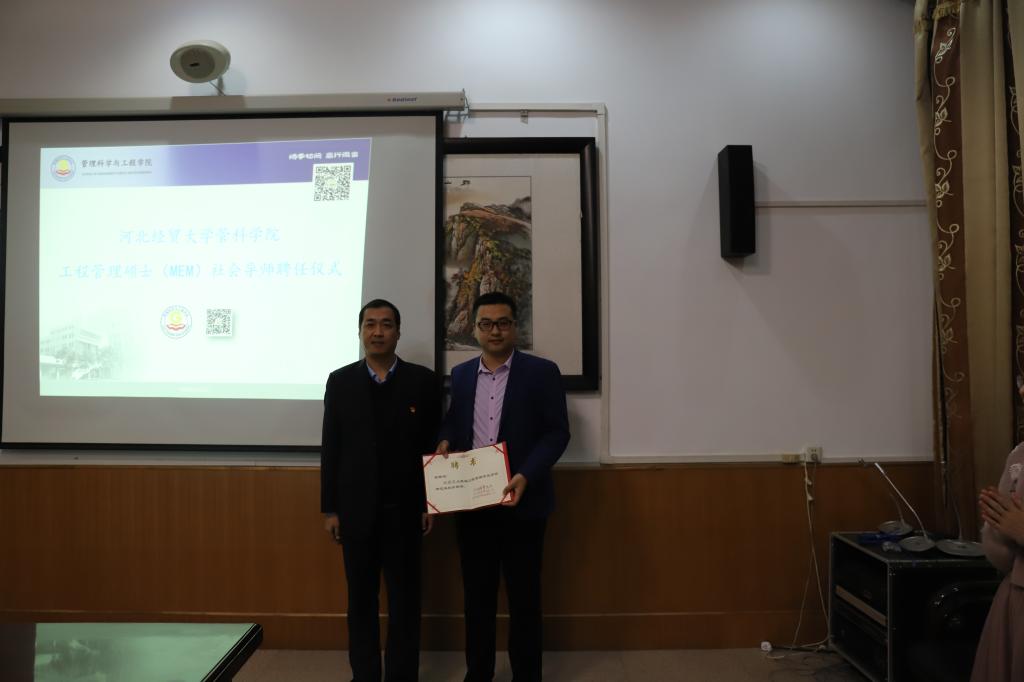 张秀山为河北新龙科技集团股份有限公司董事长杜秀珍、河北北方绿野建筑设计有限公司董事长郝卫东、河北物产供应链有限公司总经理赵少钦、中国外运河北有限公司经理姚建国、河北准诺网络有限公司总经理张建军等五位来自工程管理、信息管理和物流管理领域的研究生社会导师颁发了聘书。