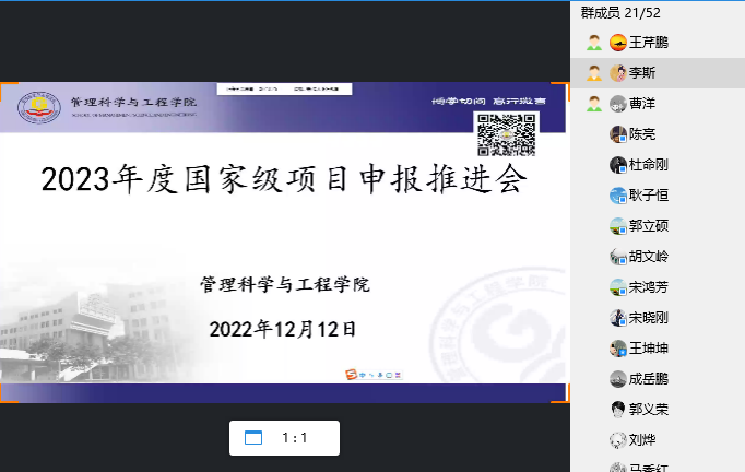 公司科研骨干教师就目前申报国家自科、社科项目的选题思路、选题背景、理论基础、课题论证和与国家战略的结合点几个方面进行了汇报,也谈了在团队组建等方面存在的问题。祁红梅分别对各位教师申报项目存在的不足进行了剖析和指导。她指出在课题申报中:一是要精心打磨选题,选题要结合最新研究前沿并契合二十大的发展战略和重大需求;二是要注重研究基础,积累科研成果,搭好研究框架,整合研究方向;三是要聚拢优势,从内部寻找资源,跨学科整合团队,形成研究梯队,发挥团队力量。