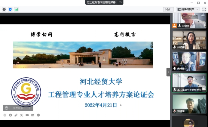 2022年4月21日,公司工程管理专业通过线上方式召开了人才培养方案修订专家论证会。会议特邀东北财经大学投资工程管理公司经理、工程管理专业教指委、评估委委员宋维佳教授,中央财经大学建设经济与管理系主任李玉龙教授,河北冀科工程项目管理公司总经理郭建明。会议由经理祁红梅主持,工程管理系全体教师参加。
