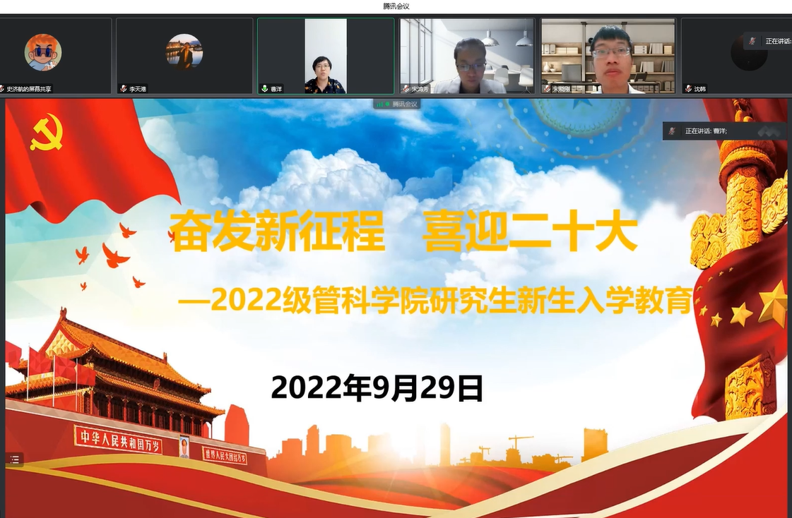 9月28日,公司学科办主任、研究生辅导员曹洋在腾讯会议线上召开了“奋发新征程 喜迎二十大-2022级管科公司研究生新生入学教育”主题班会。本次班会主要包含五项内容,即“喜迎萌新”政策解读、“铸梦管科”新生相约、“萌新知多少”知识抢答、“传承红色基因”主题观影、“我爱追梦”青春宣言。通过主题班会,进行理想信念教育、校规校纪教育、安全教育、科学道德与学风教育,帮助新生增强使命担当、开启学业规划,更好适应研究生生活。