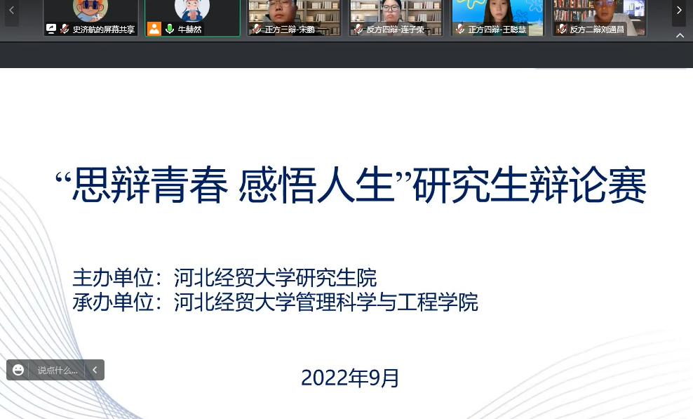 9月中下旬,管科公司承办“思辩青春 感悟人生”研究生辩论赛(研究生公司主办),全校共有12支代表队参加了比赛,历时两个星期。此次辩论赛涉及时事问题、热点事件、人生哲学等多个辩题,紧扣时代发展脉搏,给予同学们锻炼的平台和思考的空间,让大家在充分展示青春风采的同时,进一步提升语言表达、知识储备、逻辑思维、科学研究等方面能力。