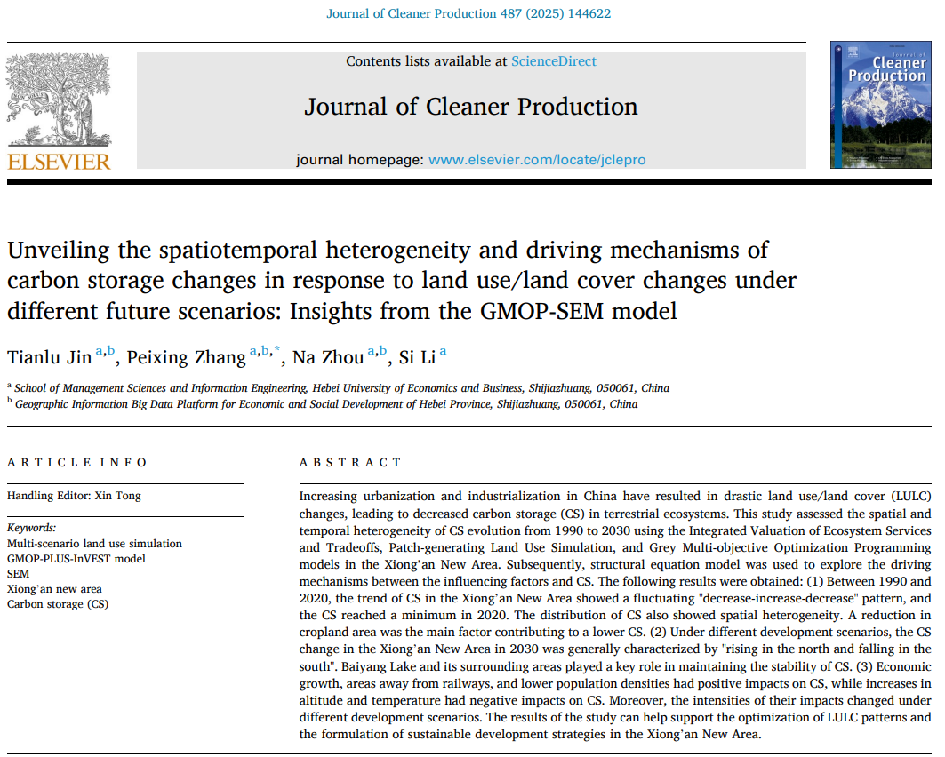 2025年新年伊始,公司研究生导师张培兴指导其2023级硕士研究生靳天禄以“Unveiling the spatiotemporal heterogeneity and driving mechanisms of carbon storage changes in response to land use/land cover changes under different future scenarios: Insights from the GMOP-SEM model”为题在中科院1区TOP期刊《Journal of Cleaner Production》上发表了该项成果。304永利集团为第一完成单位,张培兴为该论文的通讯作者。