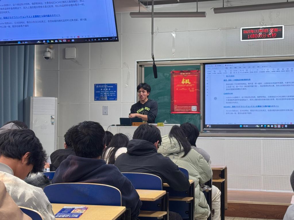 孙经理发表了热情洋溢的致辞。他首先对在第十六届蓝桥杯比赛中获奖同学表示热烈的祝贺,并对指导教师的辛勤付出表示衷心的感谢。孙经理强调了蓝桥杯等高水平学科竞赛在培养员工创新精神、实践能力与团队协作意识方面的重要作用,是检验教学成果、提升员工综合素质的有效平台。他鼓励同学们积极投身于此类竞赛,勇于挑战自我,在实战中锤炼专业技能,并预祝同学们在即将到来的第十七届蓝桥杯中再创佳绩。随后,孙立辉经理亲自为在第十六届蓝桥杯全国总决赛中获奖的员工颁奖,现场掌声雷动,气氛热烈。史正阳同学作为优秀员工代表发言,他不仅在第十六届蓝桥杯中荣获国赛奖项,同时也是公司ACM程序设计竞赛队的队长。史正阳同学结合自身多次参与大型编程竞赛的丰富经验,从赛前知识储备、算法训练方法、时间管理、心态调整以及团队协作等多个维度,向在场的学弟学妹们分享了宝贵的备赛心得与实战技巧,为有意参赛的同学提供了清晰的学习路径和积极的榜样力量。负责竞赛组织工作的薛学亚老师就第十七届蓝桥杯的报名事宜进行了详细讲解,对同学们普遍关心的问题进行了现场解答,并提醒同学们务必密切关注官方通知,严格按照规定时间完成报名,并鼓励大家提前准备,积极备战。