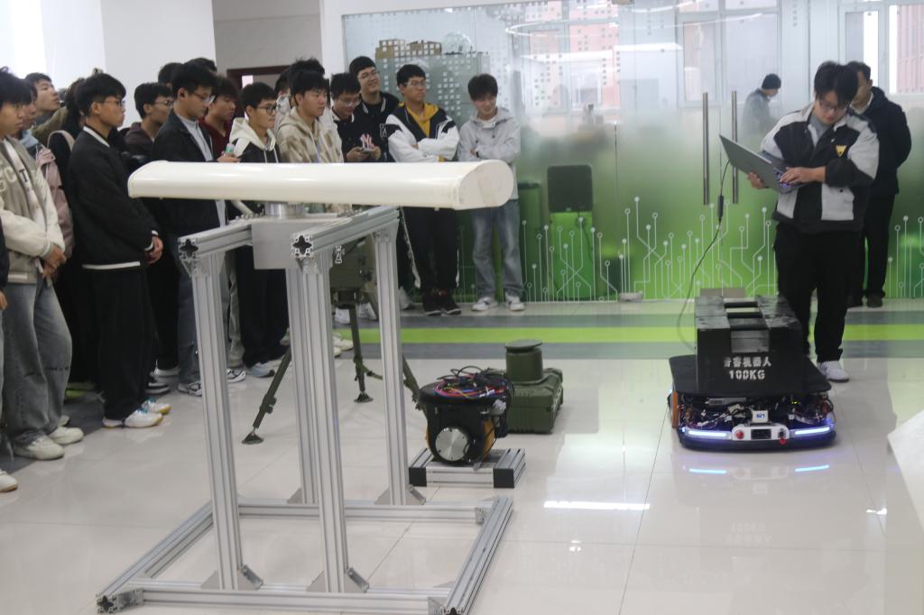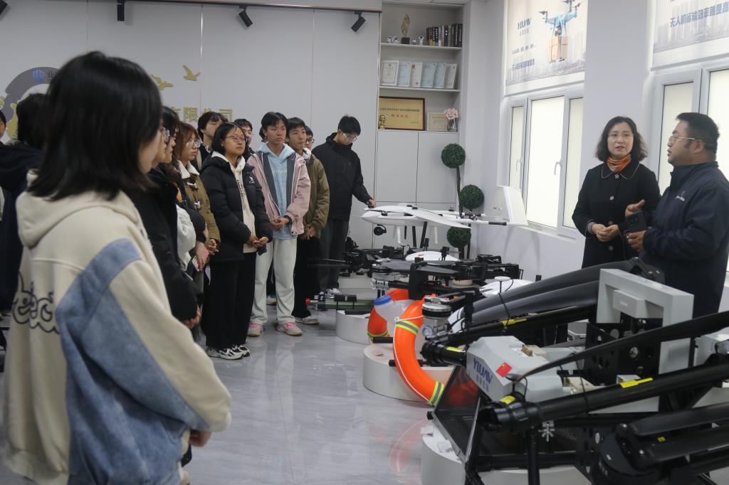 随后,师生走进河北冀航智能装备股份有限公司,重点了解无人机技术应用。展区内,电力巡检无人机整齐陈列,专业人员现场讲解航线规划与物资投放,并详解无人机通信模块与数据传输原理。