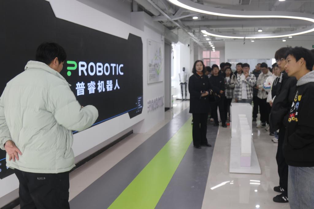首站来到普睿机器人展厅,师生们聚焦工业协作机器人与服务机器人核心技术,跟随技术人员参观了协作机器人、人形机器人等智能产品,对课本里的“运动控制算法”有了具象认知。员工们积极与相关技术人员交流技术疑问,现场学习氛围浓厚。