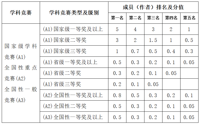 计分标准:国家级一、二、三等奖分别为10、8、6分;省(部)级一、二、三等奖记5、4、3分;市(厅)级一、二、三等奖分别计2、1.5、1分。获奖项目为多人参加的,只对前6名计分,第1名计满分,第2-3名减半计分,第4-6名按1/3计分。
