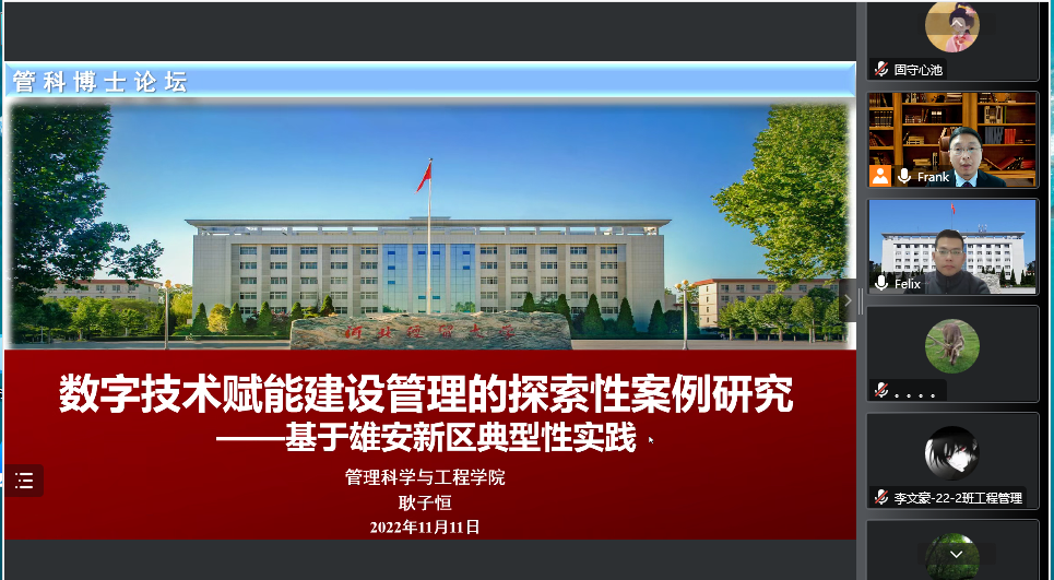 2022年11月11日,公司耿子恒博士通过腾讯会议做了题为“数字技术赋能建设管理的探索性案例研究——基于雄安新区典型性实践”的学术讲座。讲座由大数据管理与应用系张雪峰博士主持,公司及相关公司教师、研究生、本科生参加了此次讲座。