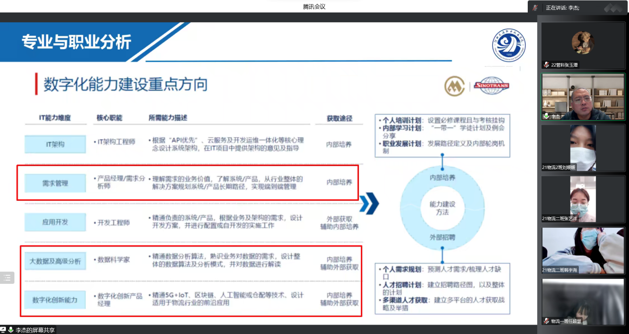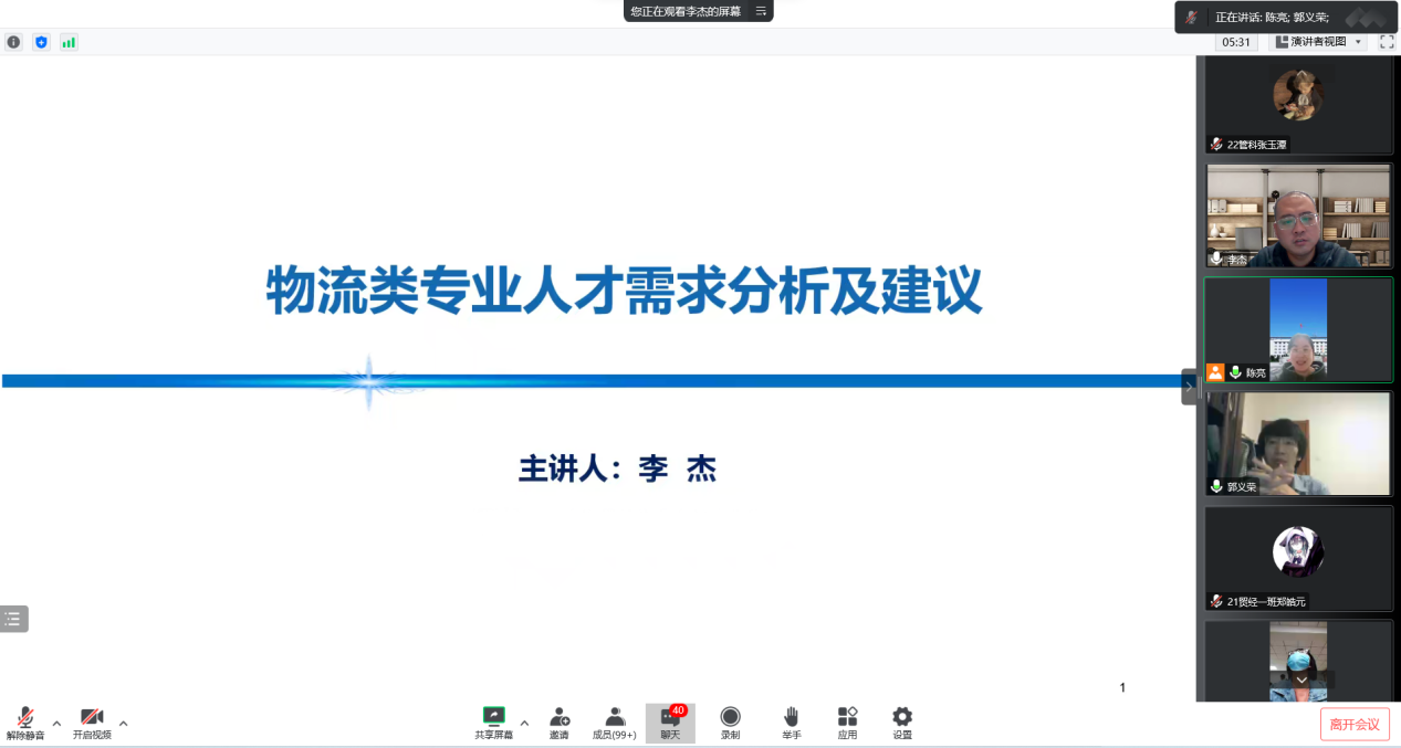 应公司邀请,河北交通职业技术公司物流系主任,中国物流产学研基地负责人李杰教授于2022年10月27日晚给公司物流系做了题为《结合物流企业发展现状分析物流行业职业规划》的讲座,本次讲座由物流系副教授陈亮主持,郭义荣等200余名物流方向师生参加。