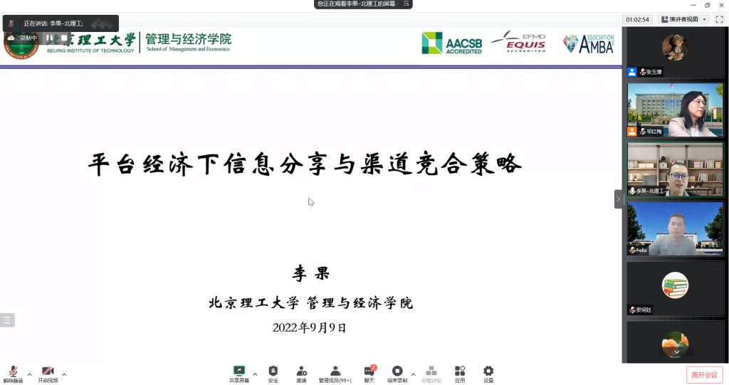 2022年9月9日,公司邀请北京理工大学李果教授在线做题为《平台经济下信息分享与渠道竞合策略》的学术讲座。讲座由公司经理祁红梅教授主持,公司相关领域师生及校外学者百余人参加了本次讲座。