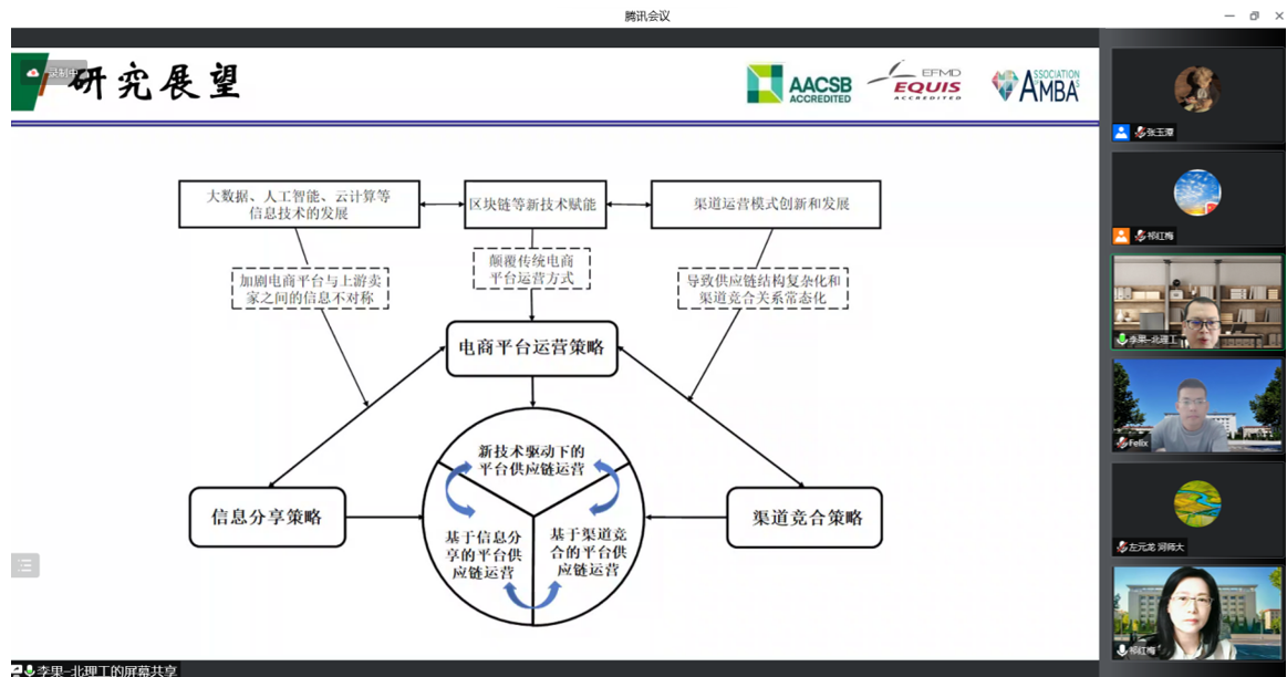 首先,李教授展示了所在团队近年来在可持续供应链管理问题上的研究框架,并从供应可持续、需求可持续和环境可持续的角度出发,讨论了如何发现问题并开展学术研究。然后,李教授向与会师生分享了近期在国际高水平期刊发表研究成果的历程,介绍了论文写作过程及投稿经验。接着,李教授以两篇典型论文为例,阐述了平台经济下供应链信息分享与渠道竞合策略,探讨了平台经济下如何寻找有价值的研究课题。最后,李教授就供应链协同创新与平台经济前沿热点问题与老师、同学们进行了交流,并对大家的提问做了详细解答。