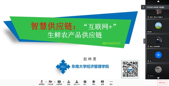 2021413日,应公司和科研处邀请,赵林度教授在腾讯会议平台做题目为智慧供应链:互联网+’生鲜农产品供应链学术讲座,讲座由祁红梅经理主持,公司全体教师、研究生以及智慧物流班本科生等共180余人聆听了此次讲座。