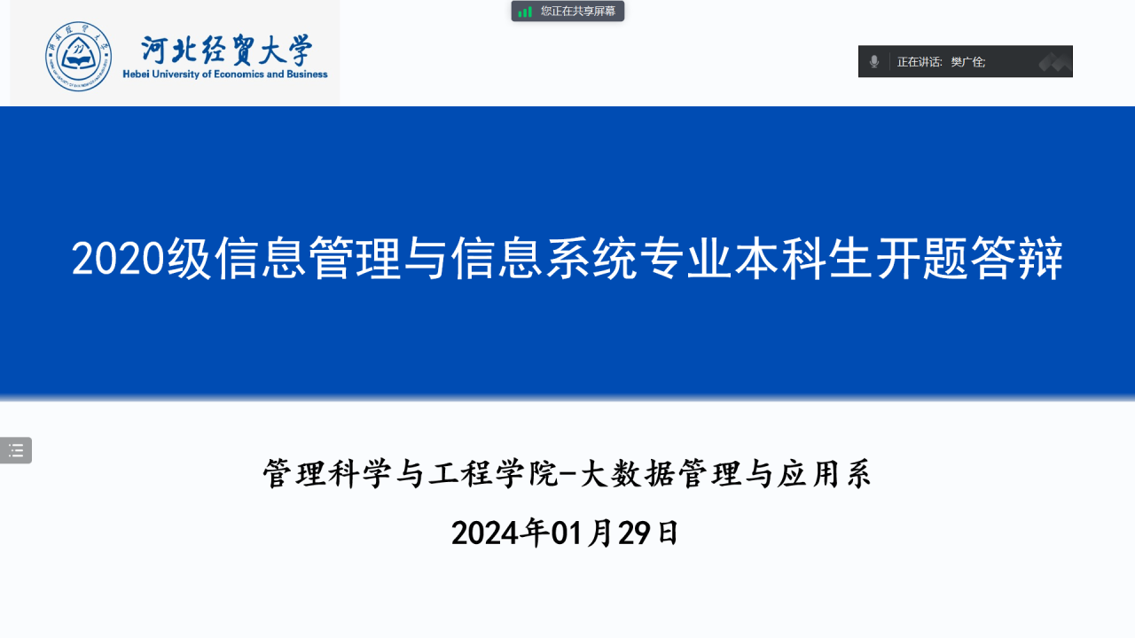 为加强大数据管理与应用系本科毕业论文工作的全链式管理,提升毕业论文水平,提高毕业生培养质量,我系按照公司2024届本科毕业论文工作计划及公司本科毕业论文质量提升工作推进会的工作要求,于2024年1月29日下午分两组举行了2024届本科生毕业论文线上开题报告答辩。
