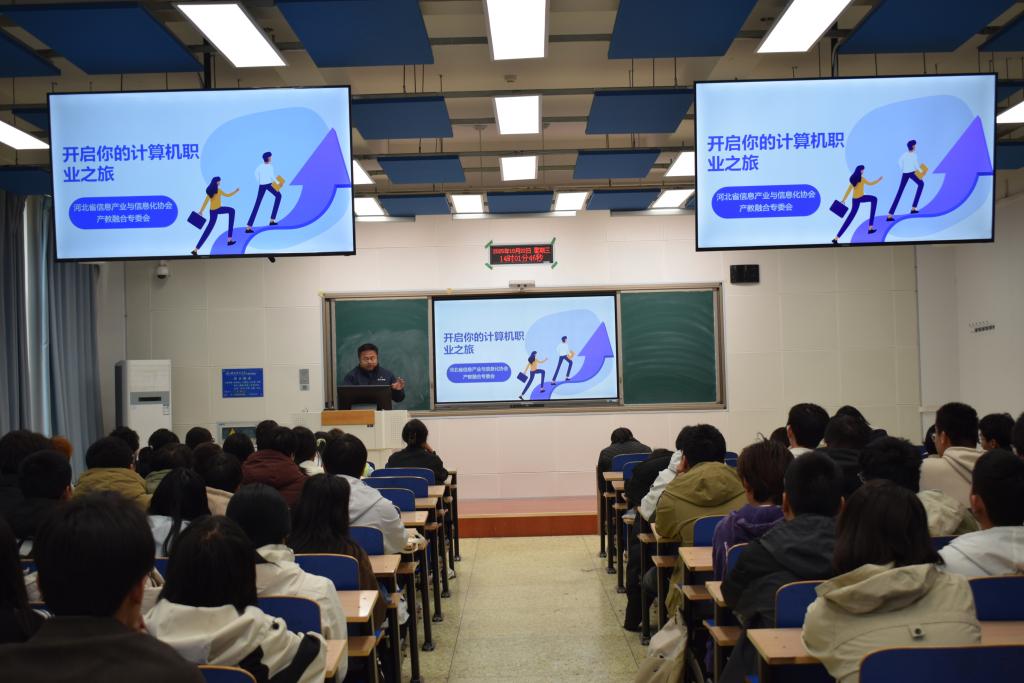 2025年10月22日,为助力大一新生深入了解计算机行业的发展前景与职业方向,304永利集团计算机科学与技术专业精心举办了一场别开生面的专业导论课程。此次课程邀请河北省信息产业与信息化协会产教融合专委会赵琪老师,为同学们带来了一场题为“开启你的计算机职业之旅”的精彩报告。