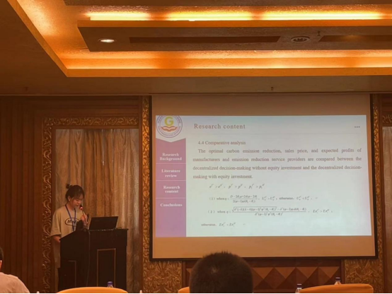 7月23日,苏雅斓受邀在《服务科学与管理专题讨论(三)》作了题为《减排外包下知情委托方契约机制研究》的汇报,师笑源和乔伟鹏在《生产运作管理专题论坛(三)》分别作了题为《考虑制造商失望规避行为的第三方减排股权投资策略》、《污物处理机制下养殖企业数智化转型演化博弈分析》的汇报,并与参会专家、学者进行交流探讨。论文评阅人对三位同学的论文进行了评价,给出了修改意见,并希望各位同学能进一步完善,争取发表高质量的文章。